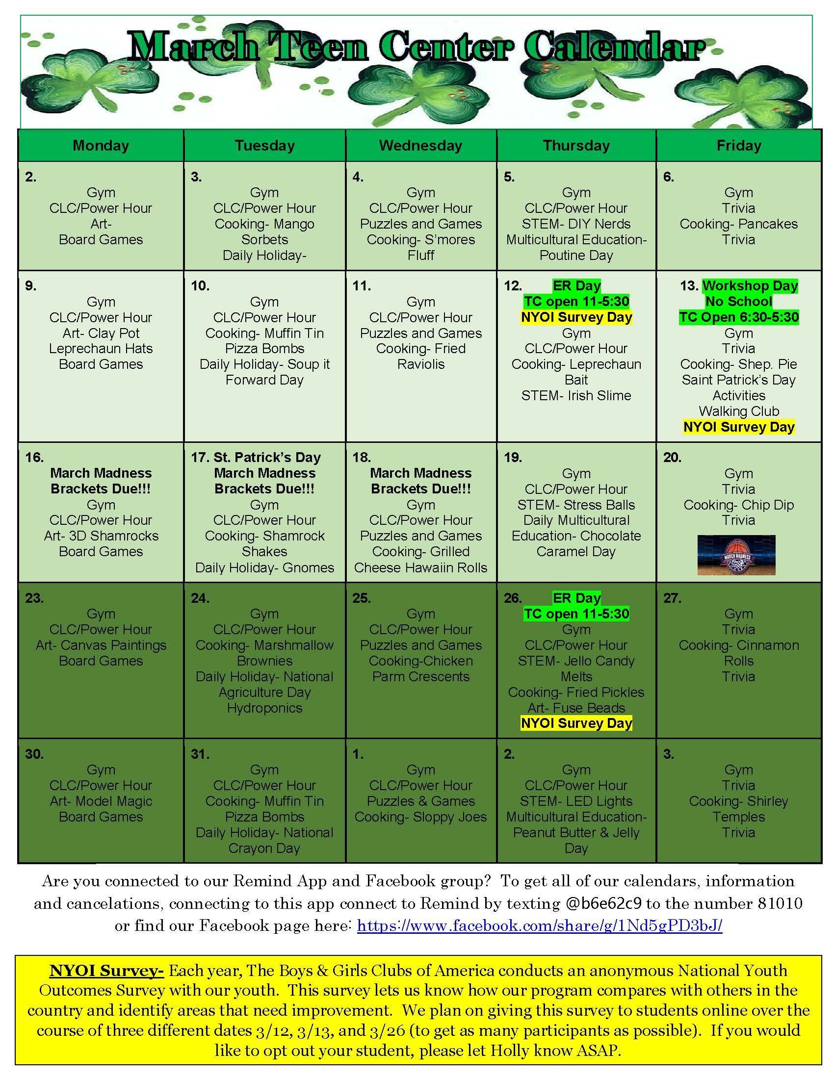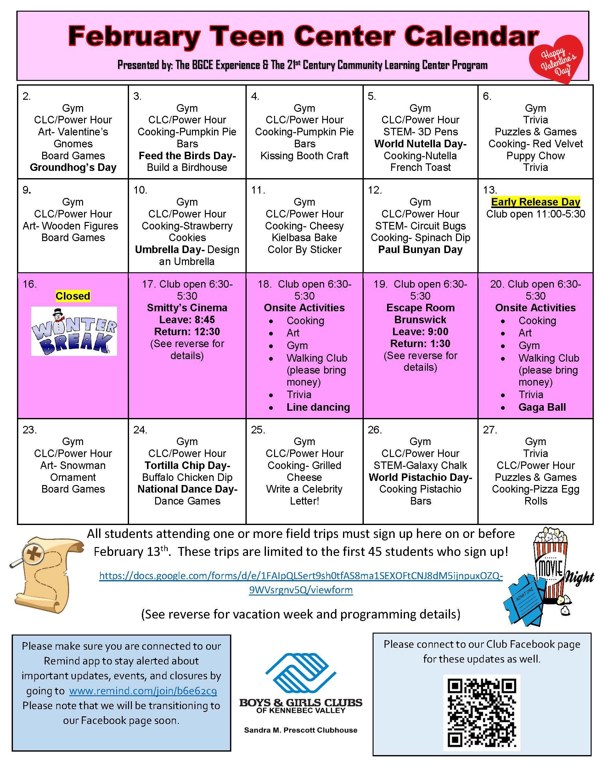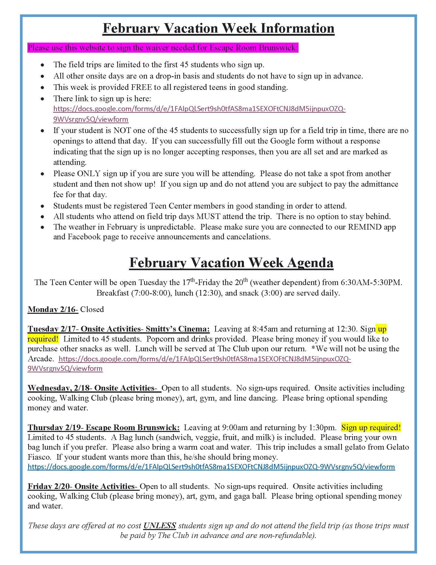 During vacation weeks, the Teen Center is open from 6:30 a.m. to 5:30 p.m. Breakfast, Lunch, and snack are provided daily. Some vacation days, teens attend trips, and cash may be required. Check the monthly calendar for details about vacation weeks.